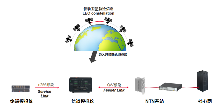 受限于(yu)國內手(shou)機(ji)直(zhi)連(lian)頻段(duan)(duan)的(de)低(di)軌(gui)衛星(xing)外場資源空缺,本(ben)次實驗(yan)室(shi)測(ce)試使用(yong)(yong)銀河航(hang)天“小蜘蛛”低(di)軌(gui)寬(kuan)帶(dai)(dai)試驗(yan)星(xing)座真(zhen)實星(xing)歷(li)數據(ju),模(mo)(mo)擬了500KM軌(gui)道高度衛星(xing)真(zhen)實運行(xing)軌(gui)跡,搭建手(shou)機(ji)直(zhi)連(lian)低(di)軌(gui)衛星(xing)的(de)用(yong)(yong)戶(hu)鏈路(lu),及衛星(xing)到(dao)(dao)NTN基(ji)(ji)(ji)站的(de)饋電鏈路(lu)的(de)端(duan)(duan)到(dao)(dao)端(duan)(duan)測(ce)試環境(jing),仿真(zhen)整(zheng)個通信過程中面臨的(de)大(da)(da)尺度空間(jian)中高動態、大(da)(da)時延、強衰減傳輸(shu)環境(jing)。采(cai)用(yong)(yong)S波(bo)段(duan)(duan)用(yong)(yong)戶(hu)鏈路(lu)與Q/V頻段(duan)(duan)饋電鏈路(lu)的(de)全鏈路(lu)配置,基(ji)(ji)(ji)于(yu)3GPP R17 NR-NTN構建了透明轉發和(he)星(xing)上處理兩(liang)種基(ji)(ji)(ji)本(ben)組網模(mo)(mo)式,成功實現了終(zhong)端(duan)(duan)和(he)基(ji)(ji)(ji)站根據(ju)衛星(xing)軌(gui)跡分(fen)(fen)段(duan)(duan)分(fen)(fen)鏈路(lu)進行(xing)多普勒超大(da)(da)頻偏補償(chang)及高動態環境(jing)下(xia)時序(xu)同步調整(zheng),完成模(mo)(mo)擬終(zhong)端(duan)(duan)、信道模(mo)(mo)擬儀、基(ji)(ji)(ji)站、核心網和(he)業務服(fu)務器的(de)端(duan)(duan)到(dao)(dao)端(duan)(duan)鏈路(lu)貫通。實測(ce)透明轉發模(mo)(mo)式下(xia)5MHz帶(dai)(dai)寬(kuan)下(xia)用(yong)(yong)戶(hu)下(xia)載速率可(ke)達5.1Mbps,最大(da)(da)環回時延15ms,用(yong)(yong)戶(hu)及饋電全鏈路(lu)補償(chang)最大(da)(da)多普勒頻偏1.03MHz,性能基(ji)(ji)(ji)本(ben)符合(he)預(yu)期,相比于(yu)此前(qian)IoT-NTN僅支持雙向(xiang)語音對(dui)講、短信等窄(zhai)帶(dai)(dai)業務能力,NR-NTN可(ke)為大(da)(da)眾手(shou)機(ji)及行(xing)業終(zhong)端(duan)(duan)用(yong)(yong)戶(hu)提(ti)供手(shou)機(ji)衛星(xing)寬(kuan)帶(dai)(dai)業務。