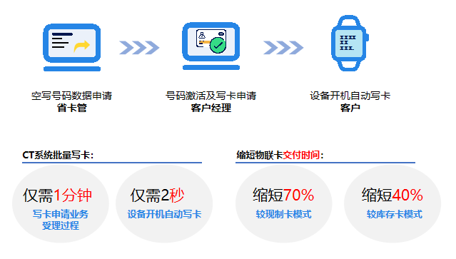 這(zhe)既包(bao)括(kuo)前(qian)文提及的(de)模(mo)組價格(ge)及物聯商城(cheng)等方面,也(ye)意味著,中移(yi)芯昇科技自(zi)研的(de)蜂(feng)窩芯片(pian)(pian)支(zhi)(zhi)持(chi)移(yi)動企標(biao)eSIM,依托此芯片(pian)(pian)的(de)產品將更便捷地(di)獲(huo)得移(yi)動資源支(zhi)(zhi)持(chi)。具體來看(kan),移(yi)動企標(biao)eSIM已經嵌入CT-BOSS系統,其一站式(shi)(shi)開(kai)卡(ka)、寫(xie)卡(ka)能力可以讓終(zhong)端廠商的(de)供應鏈管理(li)更為(wei)高效。相(xiang)較(jiao)現制(zhi)卡(ka)模(mo)式(shi)(shi),其交付時間縮(suo)短70%,較(jiao)庫存卡(ka)模(mo)式(shi)(shi)交付時間壓(ya)縮(suo)40%。