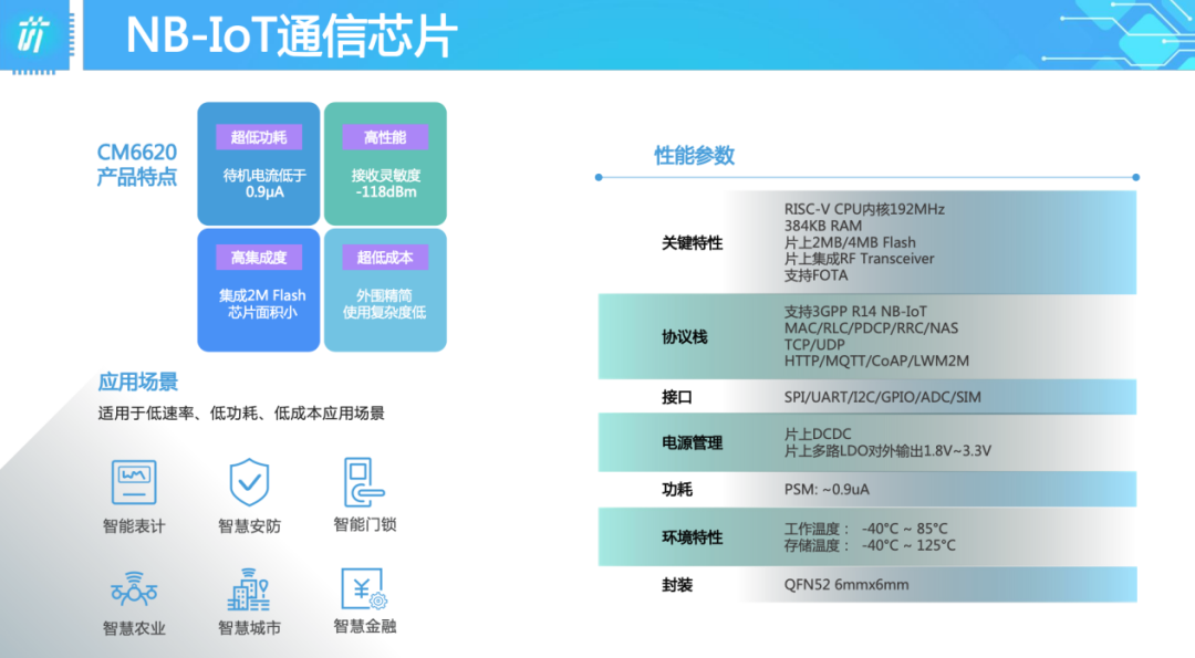 其一是NB-IoT通信芯片CM6620,采用RISC-V CPU內核,主頻(pin)192MHz,帶有384KB RAM,片上2MB/4MB flash,支持FOTA升(sheng)級。