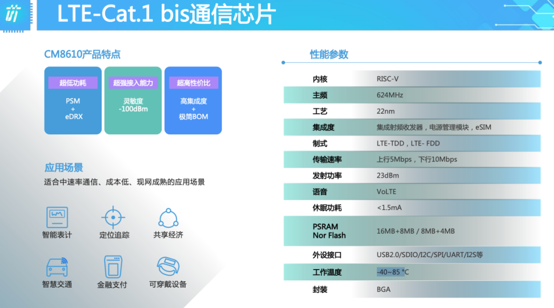 另一款產品為LTE-Cat.1 bis通信芯片CM8610,依托RISC-V內核,主(zhu)頻624MHz,22nm制程,集成射頻收發器(qi)、電(dian)源(yuan)管理模(mo)塊及(ji)(ji)eSIM,上(shang)行速率5Mbps,下行10Mbps,靈敏度為-100dBm,結合PSM及(ji)(ji)eDRX模(mo)式,其休(xiu)眠功耗小于1.5mA。