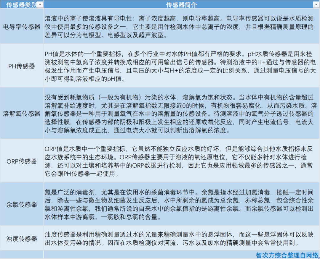 表(biao)2:水質傳感(gan)器主要(yao)分(fen)類及介紹