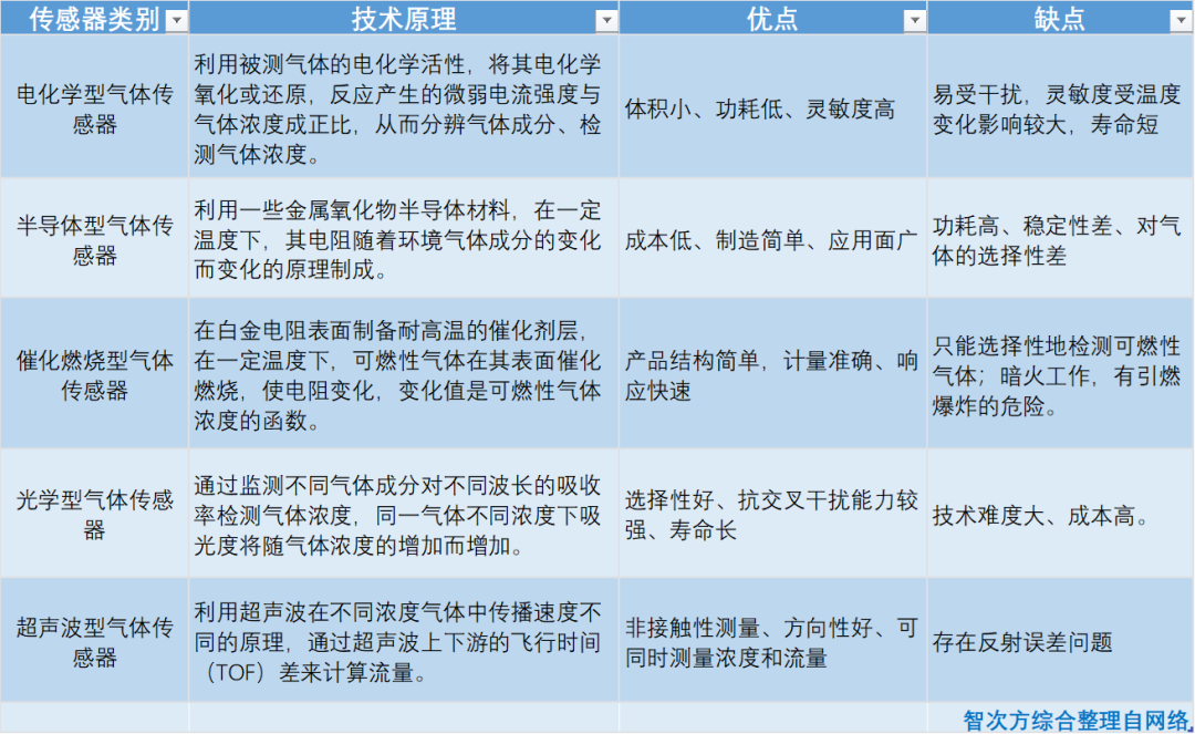 表(biao)1:氣(qi)體傳感器主要分類(lei)及介紹