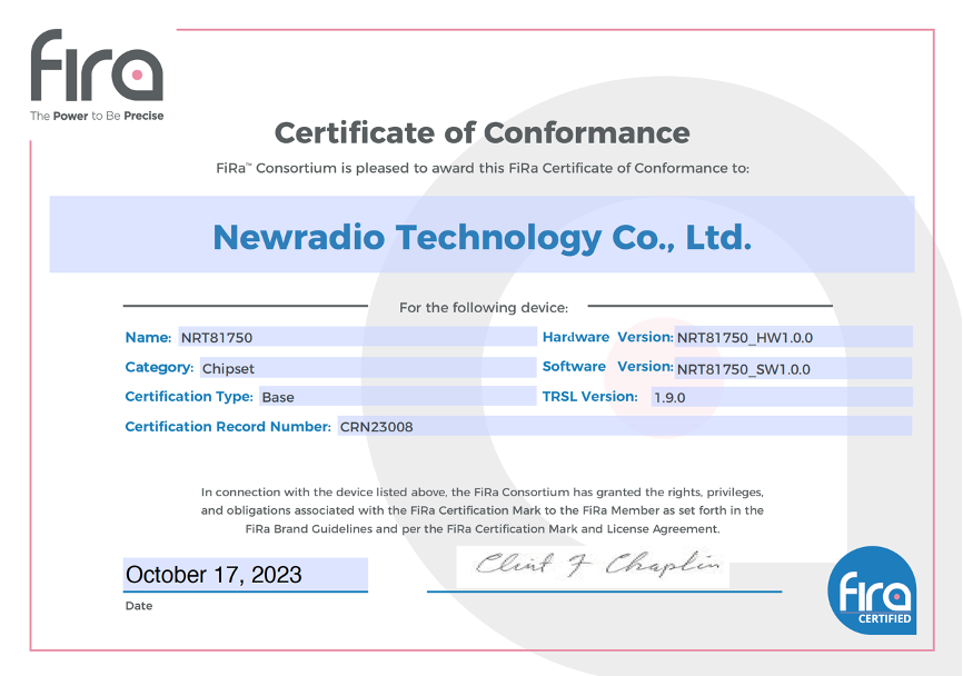 圖:NRT81750 FiRa聯盟認證證書(shu)