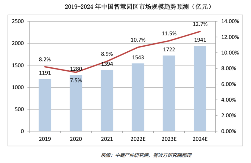 智(zhi)次方研究院(yuan)在《2023年(nian)(nian)中(zhong)(zhong)國AIoT產業全景圖譜報告》中(zhong)(zhong)判斷,智(zhi)慧(hui)園區作(zuo)為產業升級轉型的重(zhong)要(yao)載體(ti),產業穩步(bu)增長(chang),市場規(gui)模由2019年(nian)(nian)的1191億(yi)元(yuan)增至2021年(nian)(nian)的1394億(yi)元(yuan)。預(yu)計(ji)2022年(nian)(nian)智(zhi)慧(hui)園區市場規(gui)模將達(da)1543億(yi)元(yuan),2024年(nian)(nian)將進一步(bu)增至1941億(yi)元(yuan)。