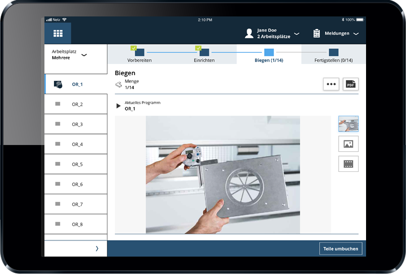 Oeon軟件的(de)(de)車間數字(zi)助(zhu)手Workmate可為每個(ge)加(jia)工(gong)(gong)步驟(zou)提供必(bi)要的(de)(de)與(yu)生產(chan)有關的(de)(de)信息——無論是(shi)2D激光切割、沖床、折彎(wan)還是(shi)手動焊接、組裝(zhuang)、噴(pen)涂(tu),都可以根據工(gong)(gong)位(wei)的(de)(de)類型,指導生產(chan)員工(gong)(gong)完成(cheng)即將到來(lai)的(de)(de)生產(chan)過(guo)程中(zhong)的(de)(de)各個(ge)步驟(zou)。