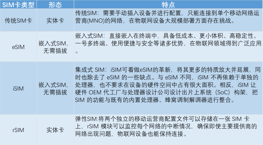 作為(wei)為(wei)物聯網設備提(ti)供數據連(lian)接(jie)和(he)通信功(gong)能的(de)介(jie)質(zhi),SIM卡的(de)重(zhong)要性無需贅(zhui)述(shu)。而(er)為(wei)了滿(man)足日益增(zeng)長的(de)連(lian)接(jie)需求(qiu),SIM卡的(de)形態和(he)功(gong)能也(ye)在不斷進化,衍生出諸如(ru)eSIM、iSIM、rSIM 等,筆(bi)者用下表對(dui)三種SIM卡進行比(bi)較: