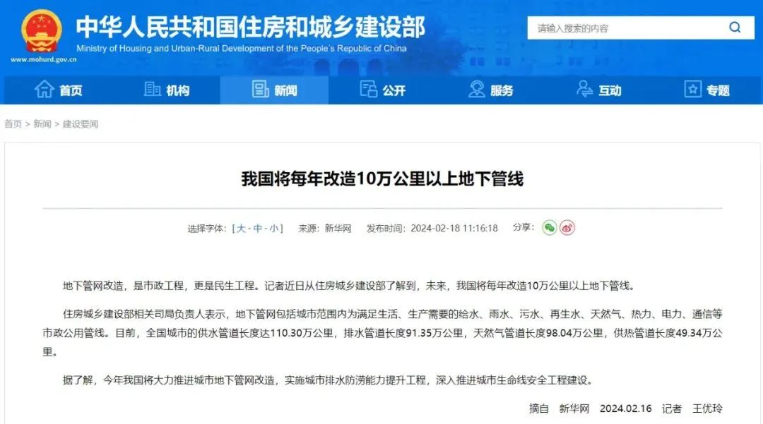 此外,2024年(nian)政府(fu)工作報告中也提出“加快完(wan)善地下管網”;住建部部長倪虹也提到,繼續加大(da)城(cheng)鎮燃(ran)氣、供(gong)水(shui)、污水(shui)、供(gong)熱等老舊管道改造力度,全年(nian)再改造10萬(wan)公里(li)以上。