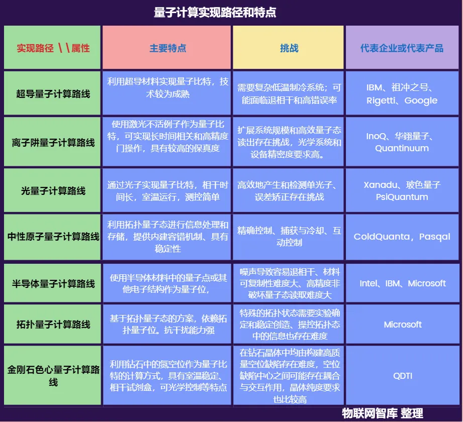 在此前的(de)文章當中(zhong),我們介紹了量(liang)(liang)子(zi)(zi)(zi)(zi)計(ji)(ji)(ji)算(suan)(suan)的(de)原理(li)和(he)特(te)點,目前,量(liang)(liang)子(zi)(zi)(zi)(zi)科技實現的(de)路(lu)(lu)徑如(ru)下:超導(dao)量(liang)(liang)子(zi)(zi)(zi)(zi)計(ji)(ji)(ji)算(suan)(suan)路(lu)(lu)線(xian)(xian)(xian)、離(li)子(zi)(zi)(zi)(zi)阱量(liang)(liang)子(zi)(zi)(zi)(zi)計(ji)(ji)(ji)算(suan)(suan)路(lu)(lu)線(xian)(xian)(xian)、光量(liang)(liang)子(zi)(zi)(zi)(zi)計(ji)(ji)(ji)算(suan)(suan)路(lu)(lu)線(xian)(xian)(xian)、中(zhong)性原子(zi)(zi)(zi)(zi)量(liang)(liang)子(zi)(zi)(zi)(zi)計(ji)(ji)(ji)算(suan)(suan)路(lu)(lu)線(xian)(xian)(xian)、半導(dao)體量(liang)(liang)子(zi)(zi)(zi)(zi)計(ji)(ji)(ji)算(suan)(suan)路(lu)(lu)線(xian)(xian)(xian)、拓撲(pu)量(liang)(liang)子(zi)(zi)(zi)(zi)計(ji)(ji)(ji)算(suan)(suan)路(lu)(lu)線(xian)(xian)(xian)、金剛石色心量(liang)(liang)子(zi)(zi)(zi)(zi)計(ji)(ji)(ji)算(suan)(suan)等(deng)。每種技術路(lu)(lu)線(xian)(xian)(xian)都有其獨(du)特(te)的(de)優(you)勢(shi)。下面是我們總結的(de)相(xiang)關列表: