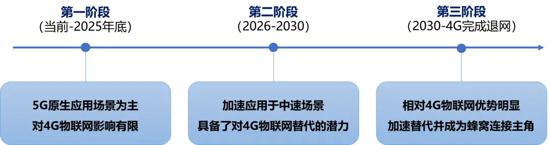 第三階段的起始時間是主管部門、運營商明確4G退網的時間節點,不過預計這一起點不會早于2030年,持續伴隨著4G退網的全過程,并在5G生命周期進入后期而終結。在這一階段,5G RedCap系列對于4G物聯網系列逐漸具備了壓倒性優勢,除了發展新的場景外,對于4G物聯網的替代迅速,使其(qi)成為蜂窩物聯(lian)網(wang)連接(jie)的主角之一。