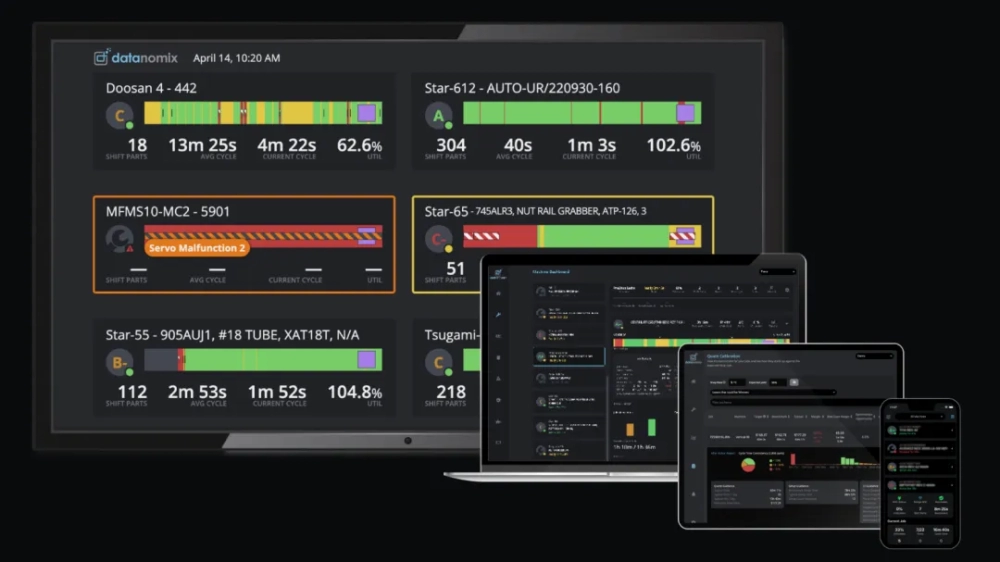 Datanomix 的(de)(de)核心產品包(bao)括旗艦產品生產監控(kong)(kong)系統(tong)、數(shu)字 GEMBA 板和(he)狀態監控(kong)(kong)系統(tong)。首先,其軟(ruan)件會(hui)收集、分析、基準測試和(he)評分來(lai)自 CNC 機器控(kong)(kong)制器的(de)(de)所有實時(shi)原(yuan)始(shi)數(shu)據;然后(hou),實時(shi)和(he)歷史(shi)洞察會(hui)顯示在移動設備(bei)、車間電視(shi)和(he)儀表板上,以向客戶團隊展示需要重(zhong)點(dian)關注或者優化改(gai)善(shan)的(de)(de)信息。