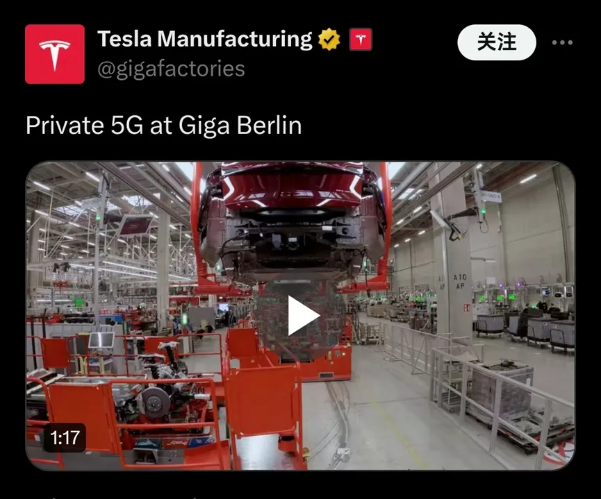 2024年(nian)5月,特斯拉通過社交網(wang)(wang)絡X(原Twitter)發(fa)布了一個(ge)短視頻(pin),展示了在其柏林(lin)工廠部署(shu)的5G專網(wang)(wang)場景。實際上,該專用網(wang)(wang)絡在2023年(nian)已開始部署(shu),一直處于概(gai)念驗證(PoC)模式(shi),知道2024年(nian)5月才開始運行。