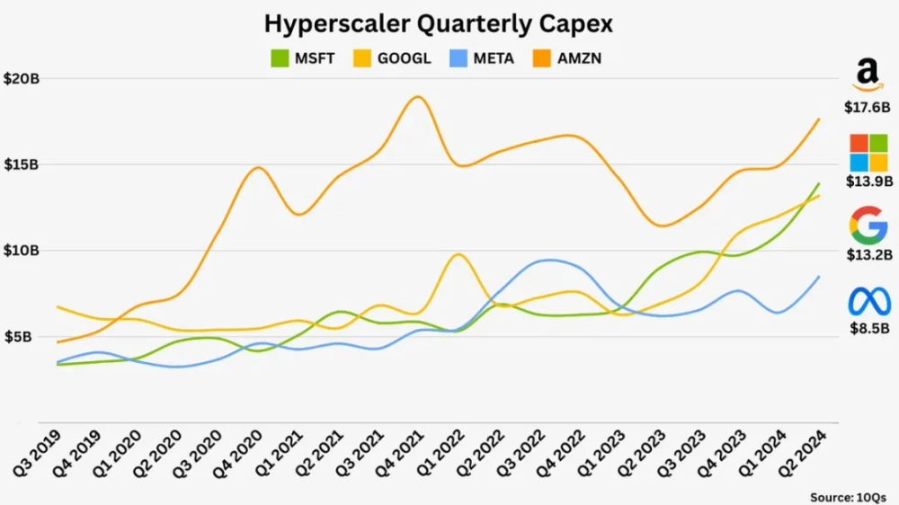 2024年(nian)上半年(nian),科(ke)技巨頭們的季度資(zi)本(ben)支出持續快速增長,尤其是在基(ji)礎設施領域的投資(zi)。正如Google公司(si)CEO劈柴哥所言:“投資(zi)不足的風險遠遠大于(yu)投資(zi)過(guo)度的風險”。這一觀(guan)點凸顯(xian)了(le)基(ji)礎設施建設對(dui)于(yu)企(qi)業發展的重要性(xing)。