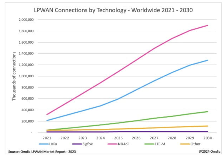 今年(nian)6月,市(shi)場研究機構發布報告顯示,低功(gong)耗廣域網 (LPWAN) 連接領(ling)域以 NB-IoT 和 LoRa 為主導(dao),2023 年(nian)這(zhe)(zhe)兩種技(ji)術合計(ji)占總(zong)連接的(de) 87%。這(zhe)(zhe)種主導(dao)地位將持續下去,預計(ji)到 2030 年(nian),這(zhe)(zhe)兩種技(ji)術將占據所有(you) LPWAN 連接的(de) 86%。