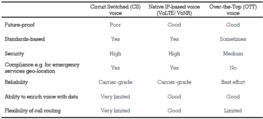 大(da)多(duo)數語(yu)(yu)(yu)音(yin)(yin)用例都需要基(ji)于原生IP的(de)語(yu)(yu)(yu)音(yin)(yin),Transforma Insights將(jiang)(jiang)基(ji)于蜂窩網(wang)絡的(de)語(yu)(yu)(yu)音(yin)(yin)技術(shu)與(yu)通過OTT語(yu)(yu)(yu)音(yin)(yin)提(ti)供(gong)相同服(fu)務進行比較,相比之下,VoLTE/VoNR在安全(quan)性(xing)、合規性(xing)、可(ke)靠性(xing)、靈活性(xing)和一系(xi)列其他因素方(fang)面表(biao)現較為(wei)突出,將(jiang)(jiang)使其成為(wei)物聯(lian)網(wang)設備需要語(yu)(yu)(yu)音(yin)(yin)的(de)場景中合適的(de)選(xuan)擇(ze)。提(ti)供(gong)語(yu)(yu)(yu)音(yin)(yin)服(fu)務的(de)要求給(gei)許多(duo)物聯(lian)網(wang)服(fu)務商帶(dai)來了(le)挑戰,服(fu)務商必須考慮語(yu)(yu)(yu)音(yin)(yin)技術(shu)解決(jue)方(fang)案的(de)可(ke)擴(kuo)展性(xing)。