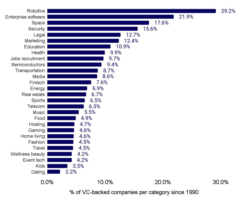 在所有風險投資支持的公(gong)司(si)中,AI公(gong)司(si)的比例在機器人、企(qi)業軟件、航空航天和安全領域最高(gao)。去年,企(qi)業軟件、醫療、金融和營(ying)銷是資金最活躍的AI類別。