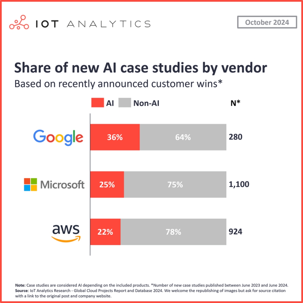 AWS的(de)AI新案(an)例(li)(li)占比(bi)(34%)比(bi)其2023年云市(shi)場(chang)份額(37%)低3個(ge)百分點,谷歌AI案(an)例(li)(li)占比(bi)(17%)較(jiao)云市(shi)場(chang)份額(9%)高(gao)8個(ge)百分點,而微軟AI新案(an)例(li)(li)占比(bi)(45%)則(ze)較(jiao)云市(shi)場(chang)份額(29%)高(gao)出16個(ge)百分點。