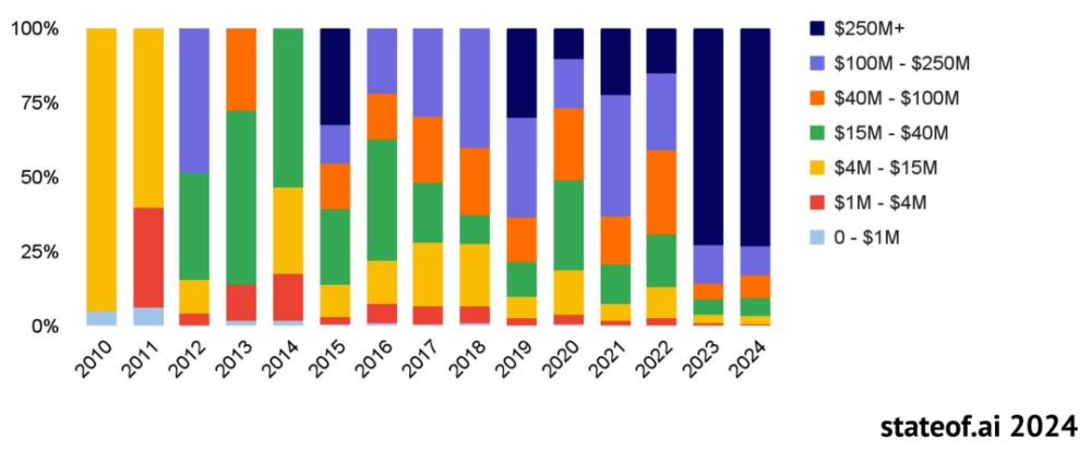 在過(guo)去兩年中,2.5億美元以上的超大輪融資主導了AI領域的融資。