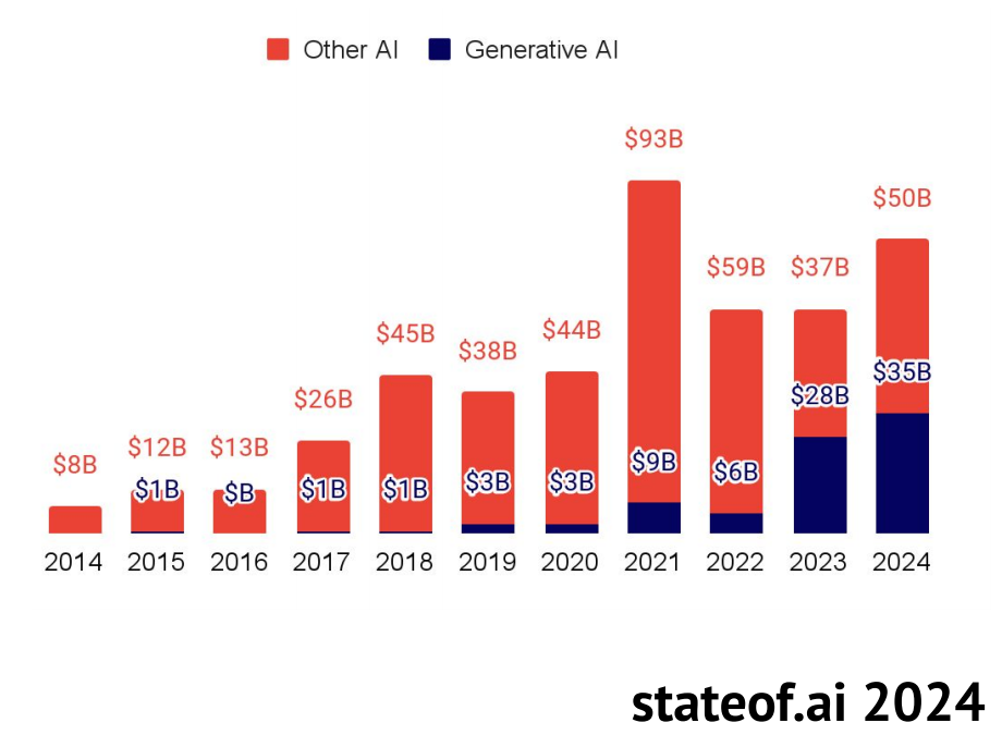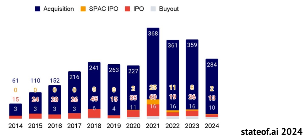 1. 人工智能公司的總市值已達9萬億美元。盡管生成式AI大獲成功,對AI初創企業的投資有所增加,但總體融資規模卻有所下降。 2. 少數頭部AI公司開始實現可觀收入,這其中既包括AI基礎模型的開發者,也包括專注視頻、音頻生成等細分領域的初創企業。然而,隨著AI模型成本的持續走低,如何實現長期可持續盈利仍是一大難題。3. 并購已成為部分難以找到可行商業模式的人工智能公司的重要出路。