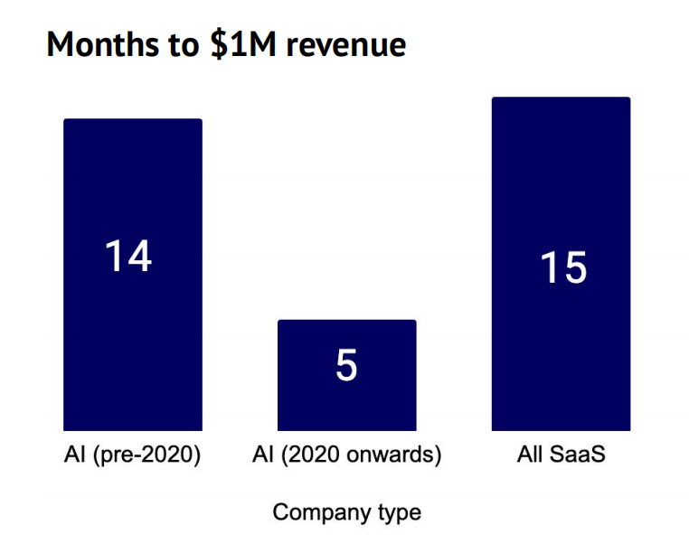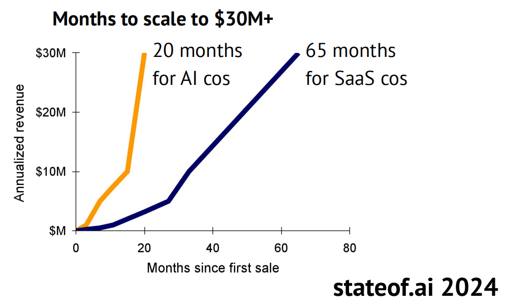 值(zhi)得注意的是,達到3000萬美元以上年收入(ru)的AI公司平均只用了20個月(yue),而同等(deng)有(you)前景的SaaS公司則需(xu)要65個月(yue)。