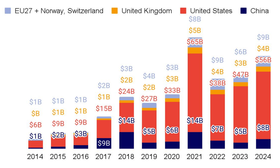 AI投資在各個地區飆升,在xAI和OpenAI等公司60億美元融資的(de)推動下,美國私(si)募(mu)市場(chang)繼續(xu)保持領先,對AI公司的(de)總投資接近1000億美元。
