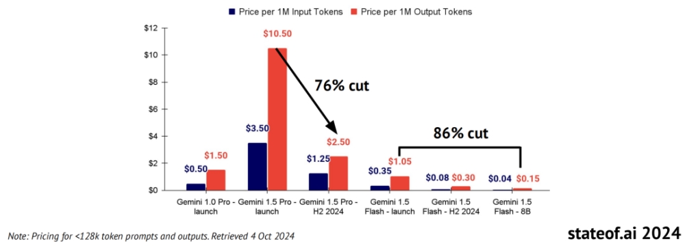 谷歌的(de)(de)Gemini系列以極具競爭力的(de)(de)價(jia)格(ge)推出(chu)了性能卓越的(de)(de)模型。Gemini 1.5 Pro和1.5 Flash在(zai)發(fa)布幾個月后,價(jia)格(ge)就下降了64~86%,同時仍保持強勁的(de)(de)性能表現。例(li)如,Flash-8B的(de)(de)價(jia)格(ge)比1.5 Flash低50%,但在(zai)許多(duo)基準測試(shi)中表現相當。