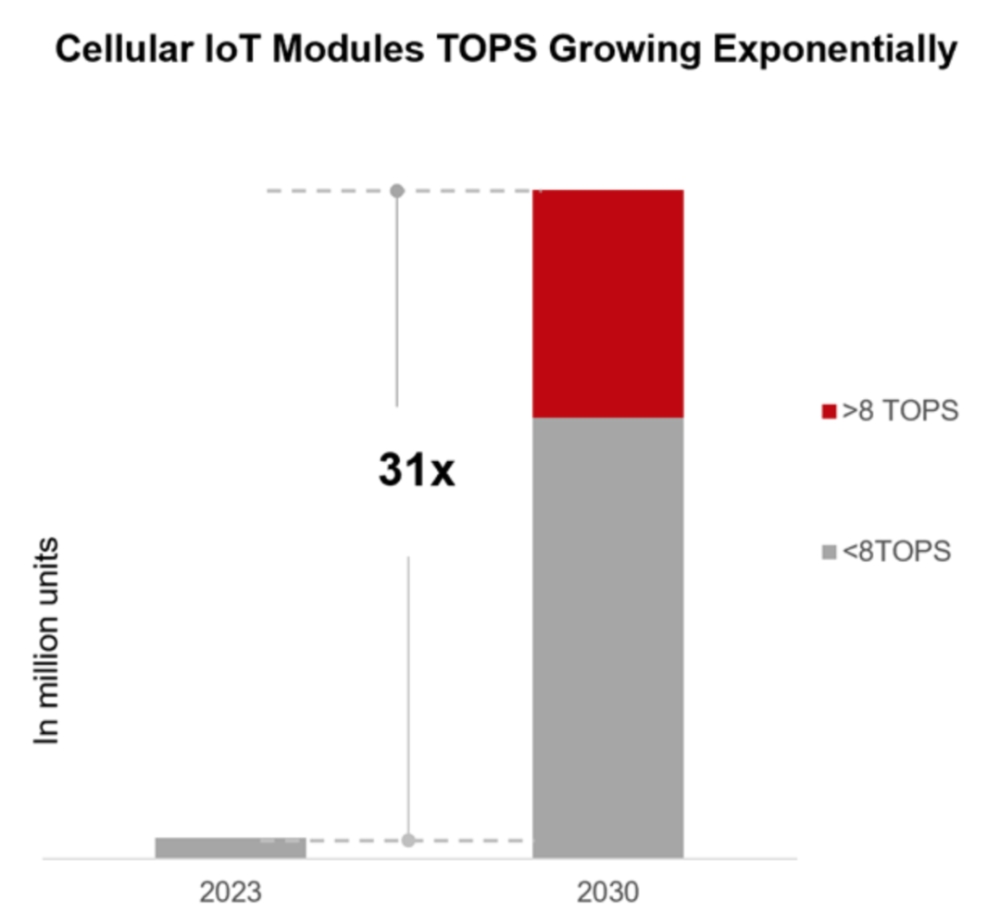 據此,邊緣AI有望迎來爆發式增長,據Counter Point預測,到2030年,搭載AI算力的物聯網模塊將占整體出貨量的25%,遠高于2023年的6%。