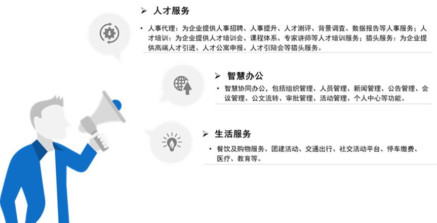 以提升(sheng)園區(qu)服(fu)(fu)務(wu)能(neng)力(li)為(wei)(wei)目(mu)標,其中,個人(ren)服(fu)(fu)務(wu),以移動(dong)端應(ying)(ying)用(yong)為(wei)(wei)主,覆蓋個人(ren)工作、生(sheng)活全方(fang)位應(ying)(ying)用(yong)服(fu)(fu)務(wu);而企(qi)業(ye)(ye)服(fu)(fu)務(wu),包含(han)專業(ye)(ye)服(fu)(fu)務(wu)、供(gong)應(ying)(ying)鏈協同服(fu)(fu)務(wu)和通(tong)用(yong)服(fu)(fu)務(wu),以幫助企(qi)業(ye)(ye)高(gao)效生(sheng)產管理(li)運營為(wei)(wei)建(jian)設(she)目(mu)標。