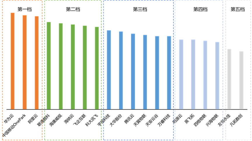 通過梳理和分析上(shang)述智(zhi)慧園區主流(liu)廠商(shang)的解決方(fang)案打造(zao)、服務提供和技術應用等情況(kuang),并(bing)結合評(ping)價指標體系,本白(bai)皮書(shu)組織(zhi)業內專家(jia)對相關廠商(shang)進行(xing)核(he)心能力(li)評(ping)分,得出(chu)如下(xia)分檔排(pai)名情況(kuang):