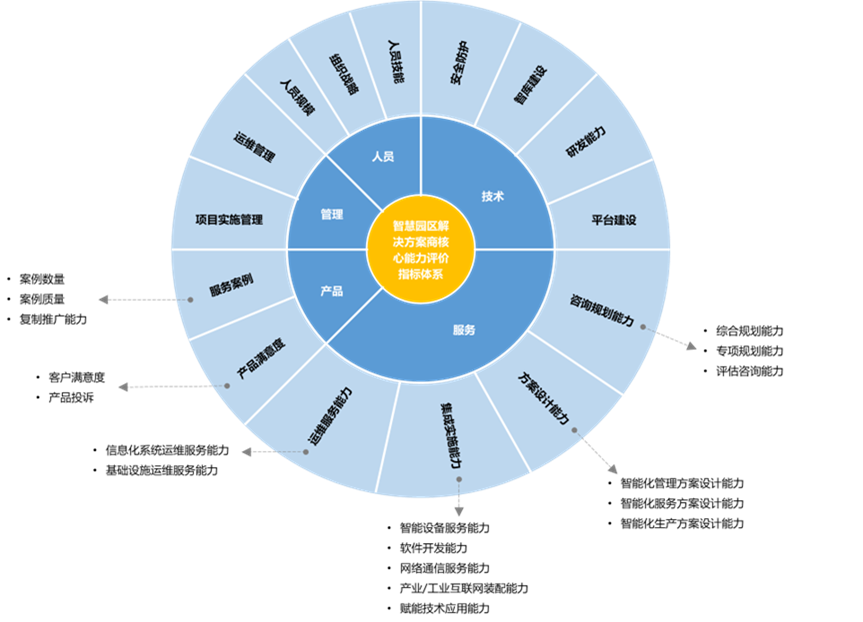融(rong)合“管(guan)理(li)”“人(ren)員(yuan)”“技術”“服務”和“產品”的(de)智慧(hui)園(yuan)區解決方案(an)商的(de)核心能力評(ping)價指標體系,可用(yong)于(yu)跟(gen)蹤企業發展(zhan)(zhan)軌跡、衡(heng)量(liang)企業發展(zhan)(zhan)現狀、評(ping)價企業發展(zhan)(zhan)潛力和預測企業發展(zhan)(zhan)趨勢。