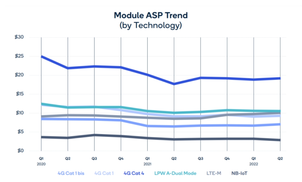 上圖顯示了全球模塊的平均銷售價格(ASP)數據。2020年,Cat 1 bis 和LPWAN 模塊的 ASP 約為10美元;自那時起,Cat 1 bis 模塊的價格已經下降(這與 Cat 1bis 在亞洲市場銷量大幅增長密切相關。)