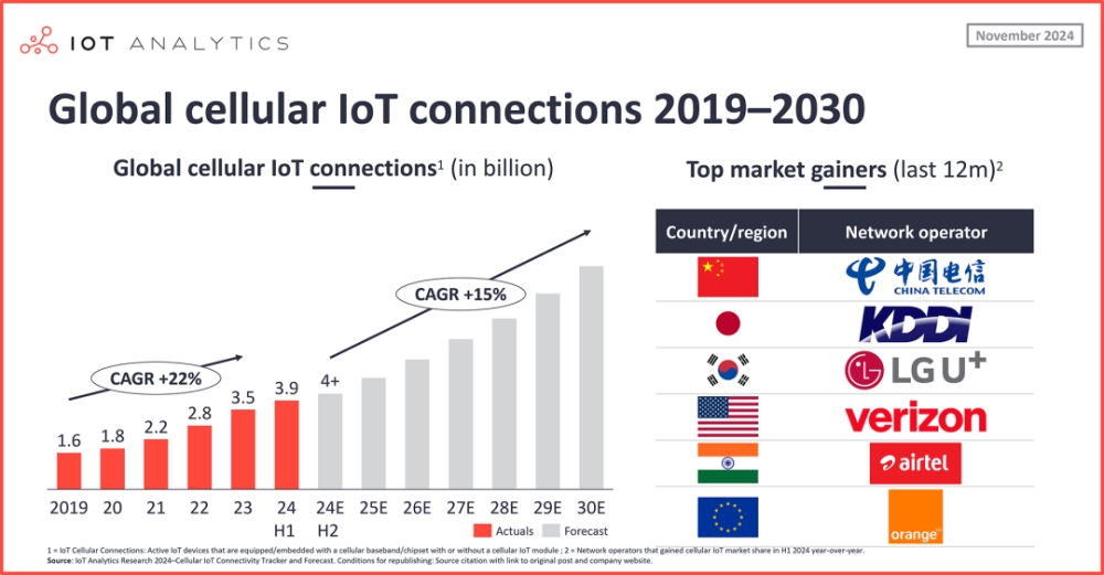 《Global cellular IoT connections surpassed 4 billion in 2024, driven by 5G and LTE Cat 1 bis》,iot-analytics