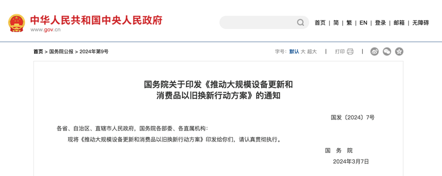 3月(yue)7日,《推動大規模設(she)備更新(xin)和消(xiao)費品以舊換新(xin)行動方案》正(zheng)式發布。