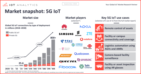 其中,基(ji)于5G公網(wang)(wang)的(de)物(wu)(wu)聯(lian)網(wang)(wang)連接(jie)(jie)在5G物(wu)(wu)聯(lian)網(wang)(wang)連接(jie)(jie)總數中占(zhan)(zhan)(zhan)據主導(dao)地(di)位(wei),截至2023年(nian)(nian)底(di)(di),5G公網(wang)(wang)物(wu)(wu)聯(lian)網(wang)(wang)連接(jie)(jie)占(zhan)(zhan)(zhan)比為(wei)95%,未來幾年(nian)(nian)仍將以58%的(de)復合(he)增(zeng)(zeng)速增(zeng)(zeng)長。2023年(nian)(nian)底(di)(di),基(ji)于5G專網(wang)(wang)的(de)物(wu)(wu)聯(lian)網(wang)(wang)連接(jie)(jie)數為(wei)128萬,占(zhan)(zhan)(zhan)5G物(wu)(wu)聯(lian)網(wang)(wang)整(zheng)體(ti)連接(jie)(jie)數的(de)比例為(wei)5%。不過,IoT Analytics認為(wei),5G專網(wang)(wang)的(de)物(wu)(wu)聯(lian)網(wang)(wang)增(zeng)(zeng)速更快,預計從2024年(nian)(nian)到2030年(nian)(nian),基(ji)于5G專網(wang)(wang)的(de)物(wu)(wu)聯(lian)網(wang)(wang)連接(jie)(jie)數將以65.4%的(de)復合(he)增(zeng)(zeng)速增(zeng)(zeng)長,屆時將占(zhan)(zhan)(zhan)全(quan)球5G物(wu)(wu)聯(lian)網(wang)(wang)連接(jie)(jie)數的(de)比例攀升至13%,連接(jie)(jie)總數為(wei)1.07億。