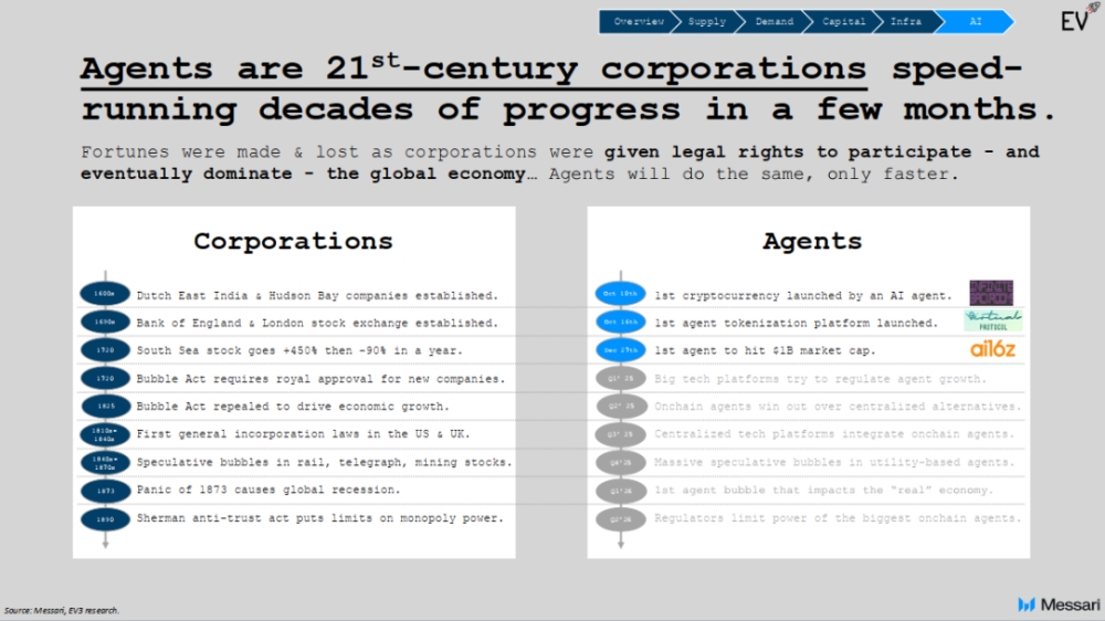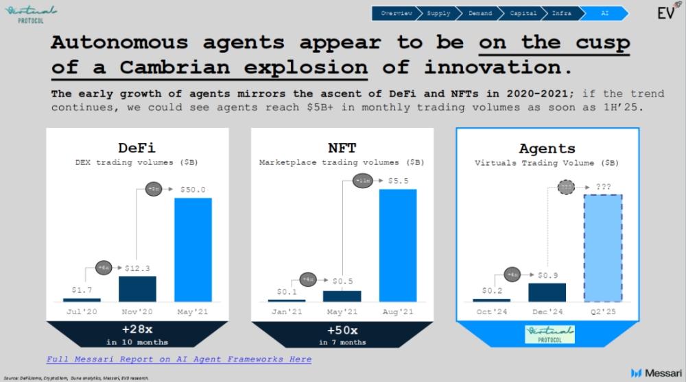 Agents(智(zhi)能代理)交易量增長目(mu)前仍不(bu)可測,體現了人工智(zhi)能在區塊鏈領域的廣闊應(ying)用(yong)空間。