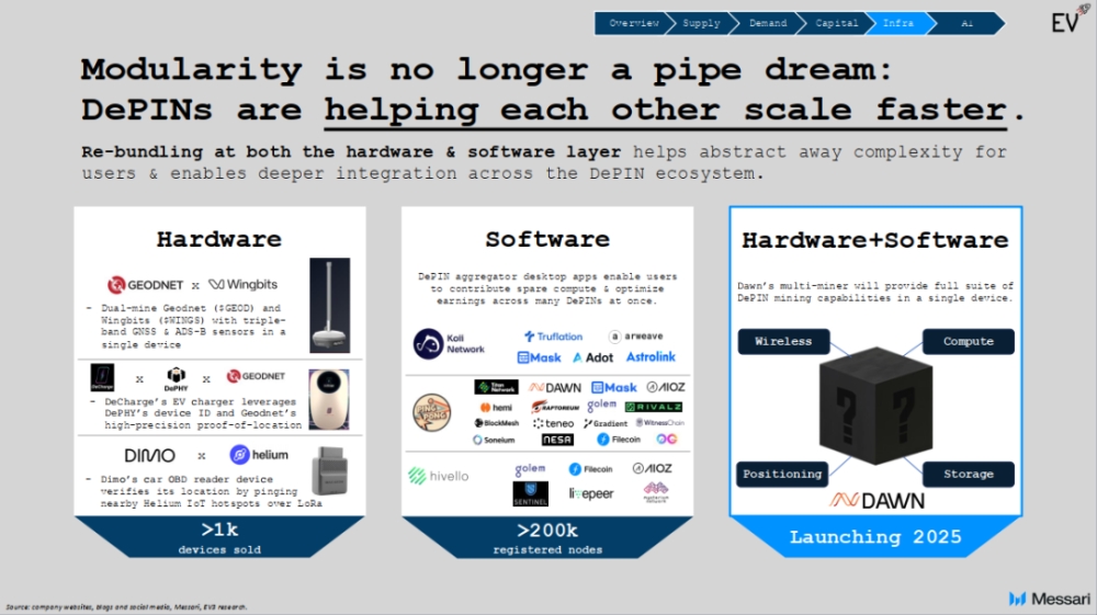 這份104頁的年度報告,以前瞻性的視角展望了2025年DePIN的趨勢走向。DePIN與人工智能AI的融合、分布式無線網絡DeWi、分布式能源網絡DeGEN、算力網絡、傳感器網絡等前沿領域均被納入分析視閾。