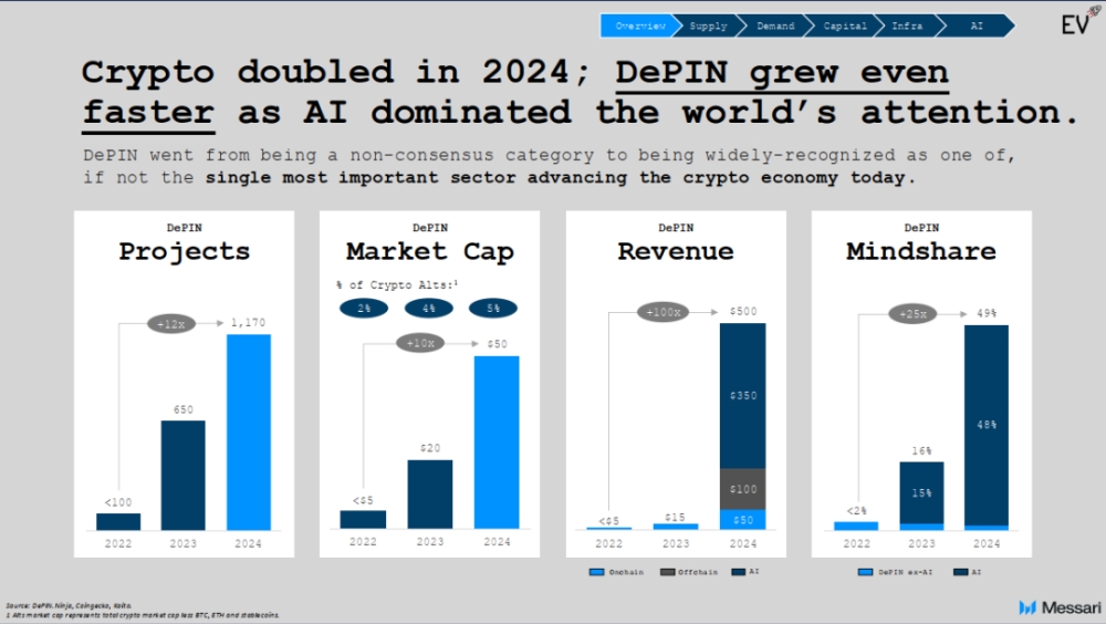 具體而言,DePIN項目數量增長了12倍,達到1170個;市值增長10倍,達到500億美元;營收增長了100倍,達到5億美元;心智份額增長了25倍,達到49%。