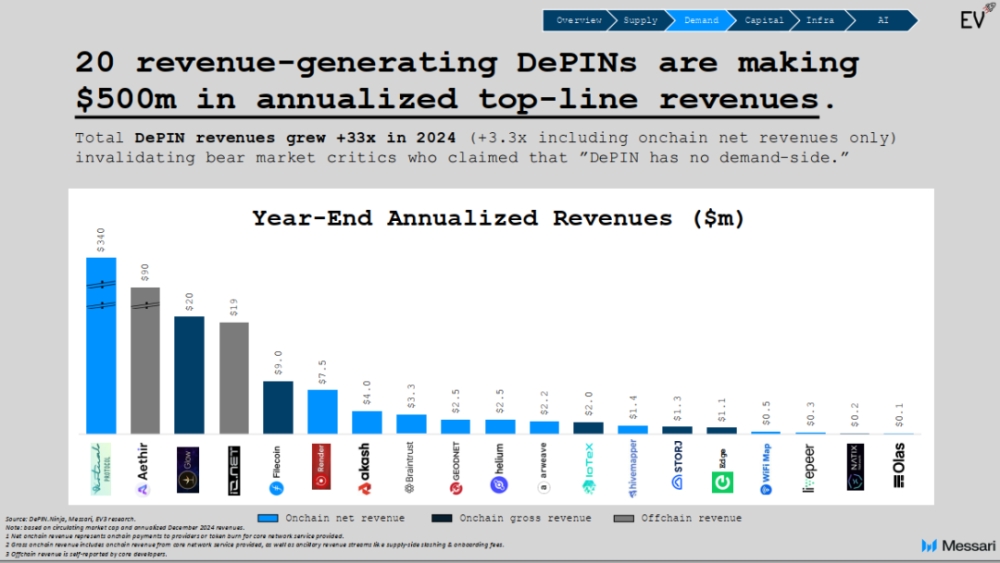有20個DePIN項(xiang)目(mu)實(shi)現了每年(nian)5億美元的(de)收入。少數具備明確投資邏輯的(de)風投(VC)將資金(jin)集中押注于最大的(de)DePIN市場。