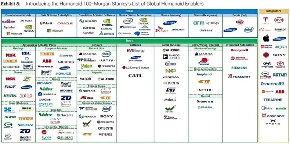 在“大腦”供(gong)應(ying)商部分(fen)(fen),上榜的中(zhong)國企業有(you)(you)百度、地平(ping)線機器(qi)人和臺(tai)積電;“身體”供(gong)應(ying)商部分(fen)(fen),中(zhong)國企業有(you)(you)旭升集團(tuan)(tuan)(tuan)、億(yi)緯鋰能、寧德時代、雙(shuang)林股份(fen)、拓普集團(tuan)(tuan)(tuan)、三花智控、匯(hui)川技術、綠的諧波、雙(shuang)環傳動、中(zhong)大力德、雷賽(sai)智能、埃斯頓、兆威機電、鳴志(zhi)電器(qi)、金力永磁、北(bei)(bei)方稀土、北(bei)(bei)特科技、恒立(li)液壓、韋爾股份(fen)、柯力傳感、速騰聚創;集成商部分(fen)(fen)有(you)(you)廣汽集團(tuan)(tuan)(tuan)、小(xiao)鵬汽車、比亞迪(di)、小(xiao)米集團(tuan)(tuan)(tuan)、阿(a)里巴巴、騰訊、埃斯頓、優(you)必選、美的集團(tuan)(tuan)(tuan)。