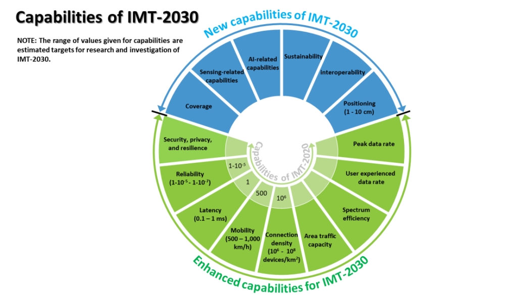 ITU針對6G定義了(le)15個(ge)能力指(zhi)標(biao)(biao),與5G相比指(zhi)標(biao)(biao)分為(wei)兩類,即針對5G增強的(de)功能和支(zhi)持(chi)6G擴展(zhan)使(shi)用(yong)場景的(de)新功能,每種功能在不(bu)同的(de)使(shi)用(yong)場景中可(ke)能具有(you)不(bu)同的(de)相關(guan)性(xing)(xing)和適用(yong)性(xing)(xing)。其中,9項功能源自(zi)現有(you)的(de)5G系統(tong),并對其進行增強,主要包括:峰值(zhi)速(su)率、用(yong)戶(hu)體驗速(su)率、頻(pin)譜效率、區(qu)域流量密(mi)度、連接數密(mi)度、移(yi)動(dong)性(xing)(xing)、時延、可(ke)靠(kao)性(xing)(xing)、安全隱私韌性(xing)(xing)性(xing)(xing)能;支(zhi)持(chi)6G擴展(zhan)使(shi)用(yong)場景的(de)新功能包括:覆蓋、感知相關(guan)指(zhi)標(biao)(biao)、AI相關(guan)指(zhi)標(biao)(biao)、可(ke)持(chi)續(xu)性(xing)(xing)性(xing)(xing)能指(zhi)標(biao)(biao)、互(hu)操作、定位6個(ge)指(zhi)標(biao)(biao)。