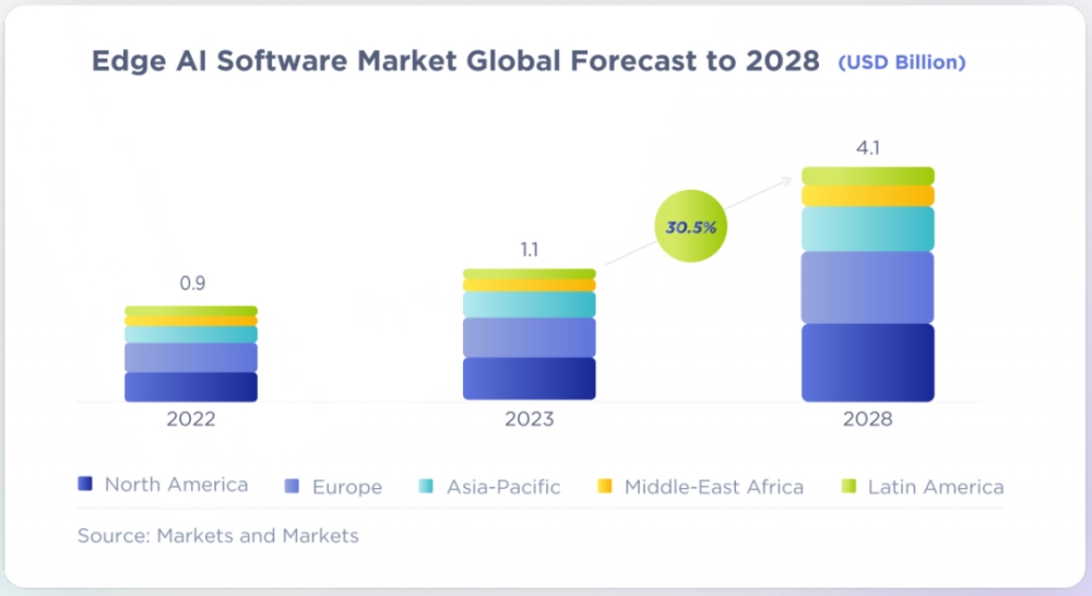 為邊(bian)緣(yuan)AI提(ti)供支持的(de)(de)軟(ruan)件和(he)硬件市場(chang)(chang)也(ye)在(zai)不斷增長(chang)。邊(bian)緣(yuan)AI軟(ruan)件解(jie)決(jue)方案正在(zai)成為現代(dai)數字基礎設(she)施(shi)不可(ke)或(huo)缺的(de)(de)一部分。這個(ge)不斷增長(chang)的(de)(de)市場(chang)(chang)涵蓋了各種工具和(he)平臺,旨在(zai)實現從物聯網(wang)傳感(gan)器到工業(ye)設(she)備(bei)等邊(bian)緣(yuan)硬件的(de)(de)AI推(tui)理和(he)訓練。邊(bian)緣(yuan)AI軟(ruan)件的(de)(de)全球(qiu)市場(chang)(chang)規模預計將從2023年的(de)(de)11億美元增長(chang)到2028年的(de)(de)41億美元。