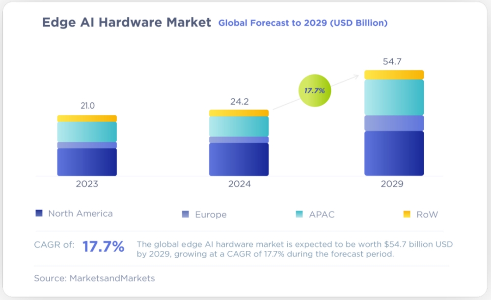 在硬件方面,根據(ju)Markets and Markets的(de)數據(ju),到(dao)(dao)2029年,全(quan)球(qiu)邊緣AI硬件市(shi)場價(jia)值(zhi)預計將達到(dao)(dao)547億美(mei)元。