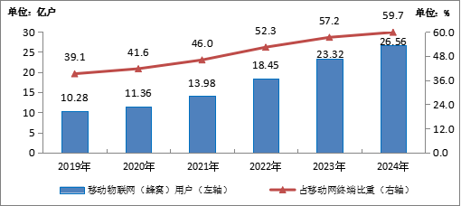 過去幾年,移動物聯網迎來快速增長,從2019年(nian)(nian)末用(yong)戶數(shu)10.28億增長到(dao)2024年(nian)(nian)末26.56億,給相關物聯(lian)網(wang)連接和(he)運營(ying)的廠商帶(dai)來增量(liang)收益(yi)。