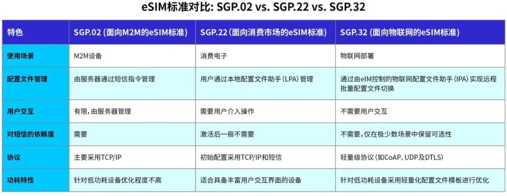 eSIM(嵌(qian)入式SIM卡)實(shi)(shi)現(xian)了(le)無需(xu)更(geng)換實(shi)(shi)體SIM卡即可(ke)遠(yuan)程(cheng)管理運營商配置(zhi)文件。然(ran)而(er),現(xian)有的(de)(de)(de)SGP.02標準在大(da)規(gui)模設備管理方面較為復雜,尤其是在動(dong)態(tai)更(geng)改配置(zhi)文件時。由全球移動(dong)通(tong)信系統協會(GSMA)制定(ding)的(de)(de)(de)新(xin)標準SGP.32,在以往(wang)嵌(qian)入式 SIM(eSIM)解決方案的(de)(de)(de)基礎上做了(le)進一步(bu)升級,專門針對(dui)當(dang)數以百萬計(ji)的(de)(de)(de)設備通(tong)常分布在全球各地(di),難以進行物理接觸式操作的(de)(de)(de)IoT場景(jing)而(er)設計(ji)。